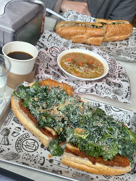 LIBERTY KITCHEN: Finally got my hands on the viral Chicken cutlet Kale Caesar. It is massive and delicious but what’s really next on my list is their chicken parm. Will report back. PS always get a soup when you go here, taste like something straight out of grams kitchen.