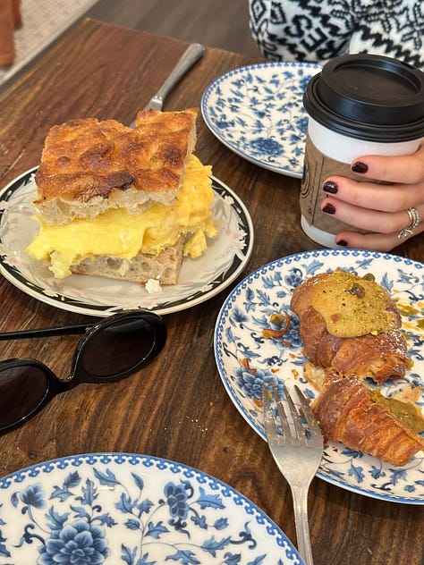 FIORE: The saltie breakkie sando is a freaking must (++bacon) the softest fluffiest scrambled eggs and whipped ricotta on focaccia. Then order the Pistachio Cornetti as a little sweet treat too.